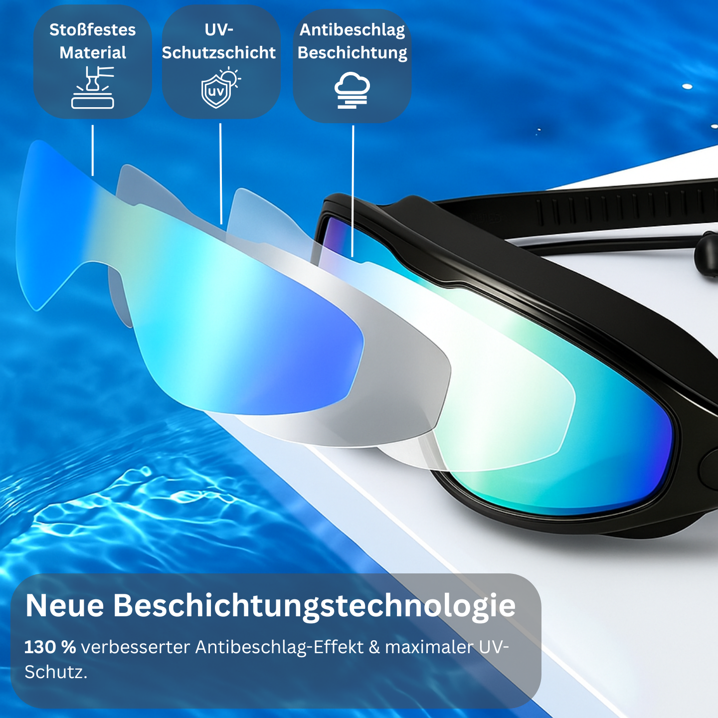 Die UV-Spiegelbeschichtung der Earlox Schwimmbrille schützt Ihre Augen effektiv vor schädlichen Sonnenstrahlen. So bleiben Ihre Augen gesund und Sie können unbesorgt im Freien schwimmen.